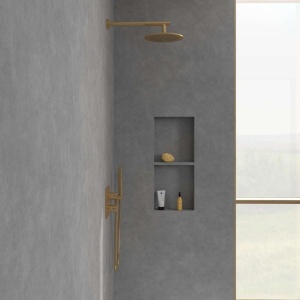 Capul de duș din colecția Universal Showers de la Villeroy & Boch este o soluție potrivită pentru persoanele care își doresc o experiență relaxantă, similară cu cea de la spa, chiar în propria baie. Cu un design rotund și un finisaj auriu periat, acest model aduce un plus de modernitate și eleganță spațiului sanitar. Este versatil, permițând instalarea atât pe perete, cât și pe tavan, integrându-se astfel cu ușurință în diverse concepte de amenajare interioară.